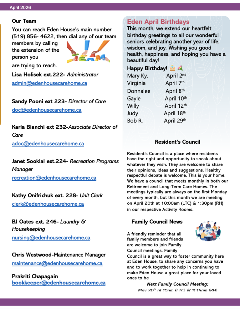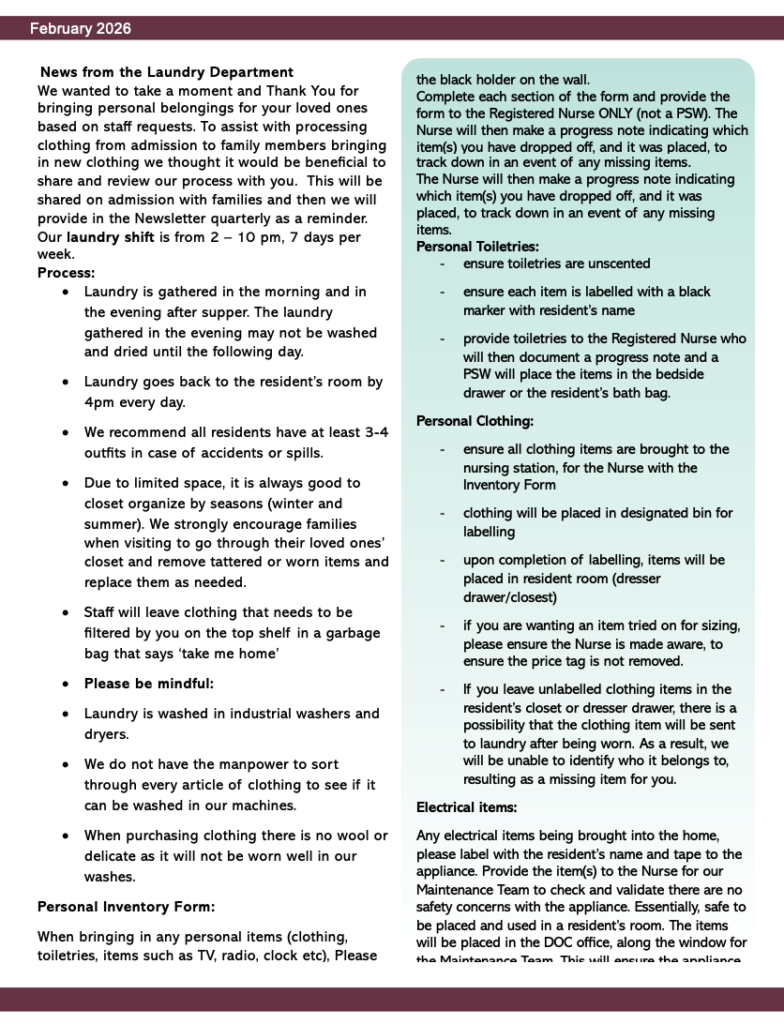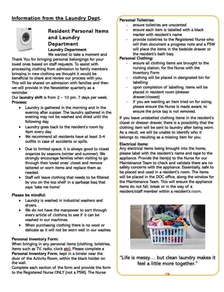 Retirement Home Retirement Home Features of the Retirement Home private accommodation, including hydro, heat and wateremergency response system24 hour supervisionthree meals per day with menu style service morning, afternoon and evening snackmedication administration and supervisionweekly bath preparationhousekeeping servicesdaily laundry (personal clothing & linens)bedroom furniture (bedside table and dresser)daily activities programming including outings